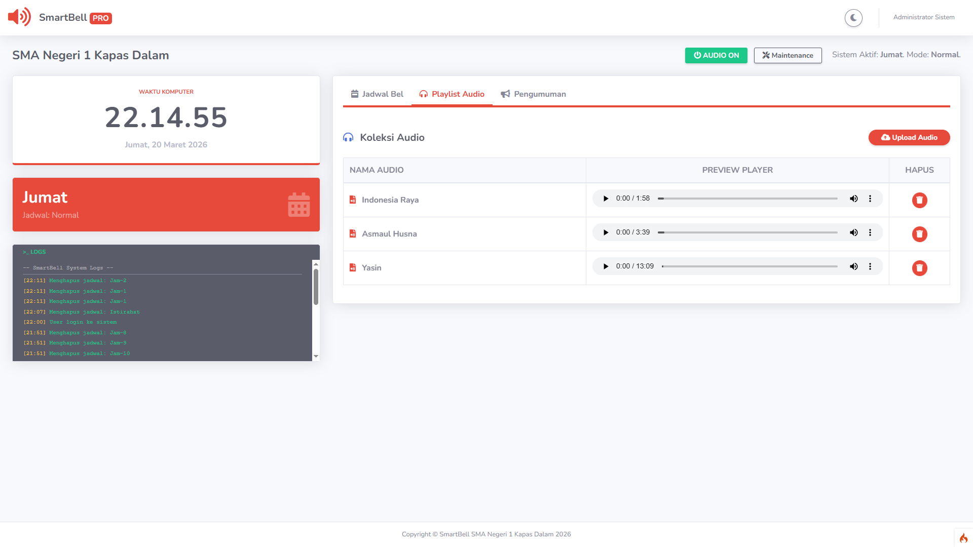 🎵 Custom Playlist Audio Bebas mengunggah (upload) file musik format MP3 sesuka hati. Gunakan lagu daerah, mars sekolah, hingga murottal untuk jam istirahat atau pergantian jam.
