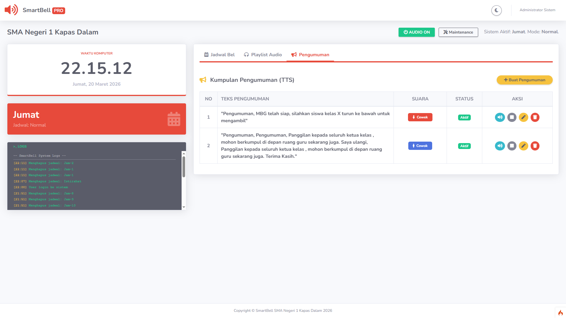 📢 Text-to-Speech (Robot Pengumuman) Cukup ketik teks pengumuman, dan sistem akan mengubahnya menjadi suara manusia (tersedia pilihan suara pria & wanita). Sangat cocok untuk panggilan siswa atau pengumuman mendadak.