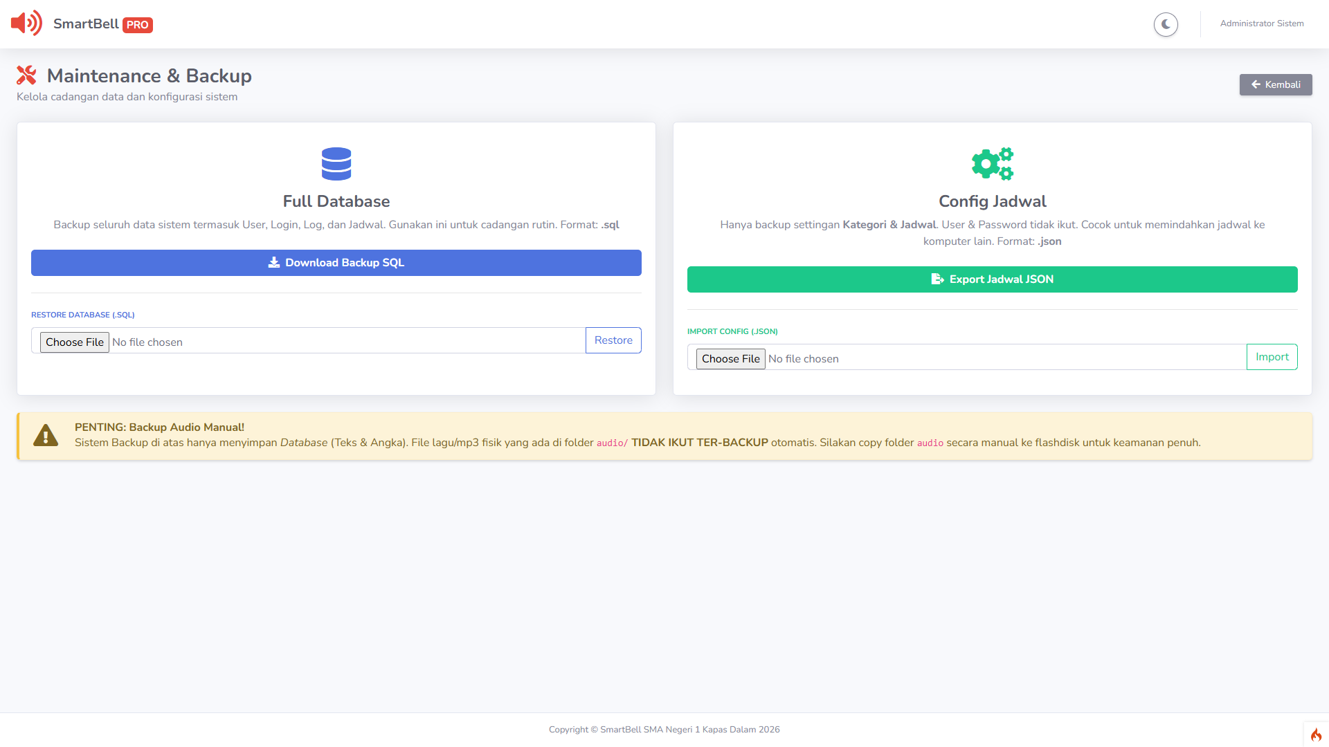 🛡️ Panel Maintenance & Backup Data sangat aman! Tersedia fitur Backup & Restore database (.sql) serta ekspor/impor konfigurasi jadwal (.json) hanya dengan satu kali klik.