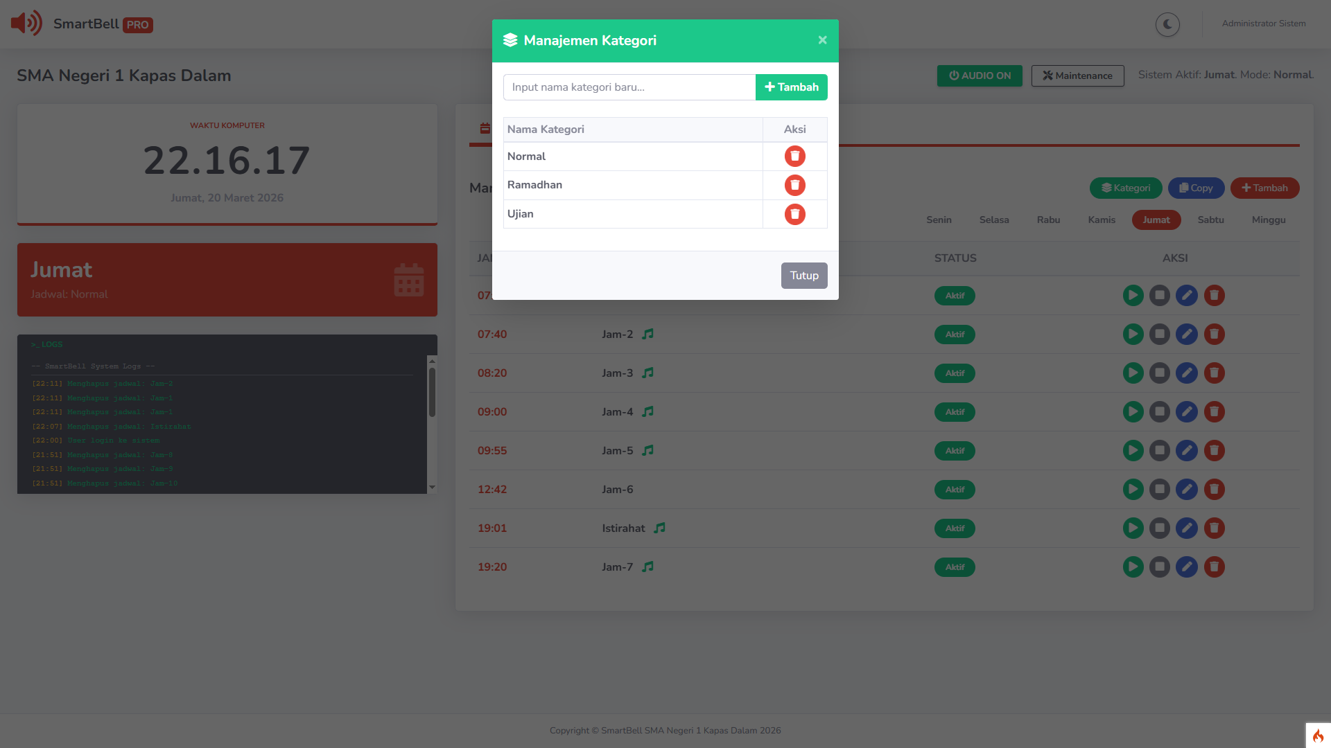 📅 Manajemen Jadwal Cerdas & Dinamis Mendukung berbagai kategori jadwal (Normal, Ramadhan, Ujian). Tersedia fitur Copy Jadwal antar hari sehingga Anda tidak perlu repot mengetik ulang jadwal yang sama.