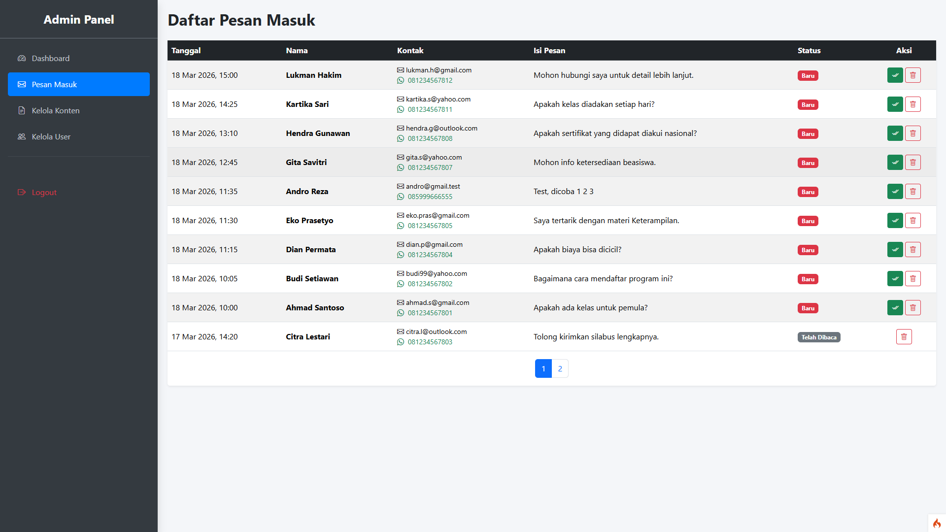 📩 Manajemen Pesan Terpusat (Lead Generation) Setiap pesan atau pertanyaan yang dikirim pengunjung melalui landing page akan terekam rapi di Panel Admin. Dilengkapi dengan indikator status (Baru / Telah Dibaca) dan pagination agar Anda tidak pernah melewatkan calon klien potensial.