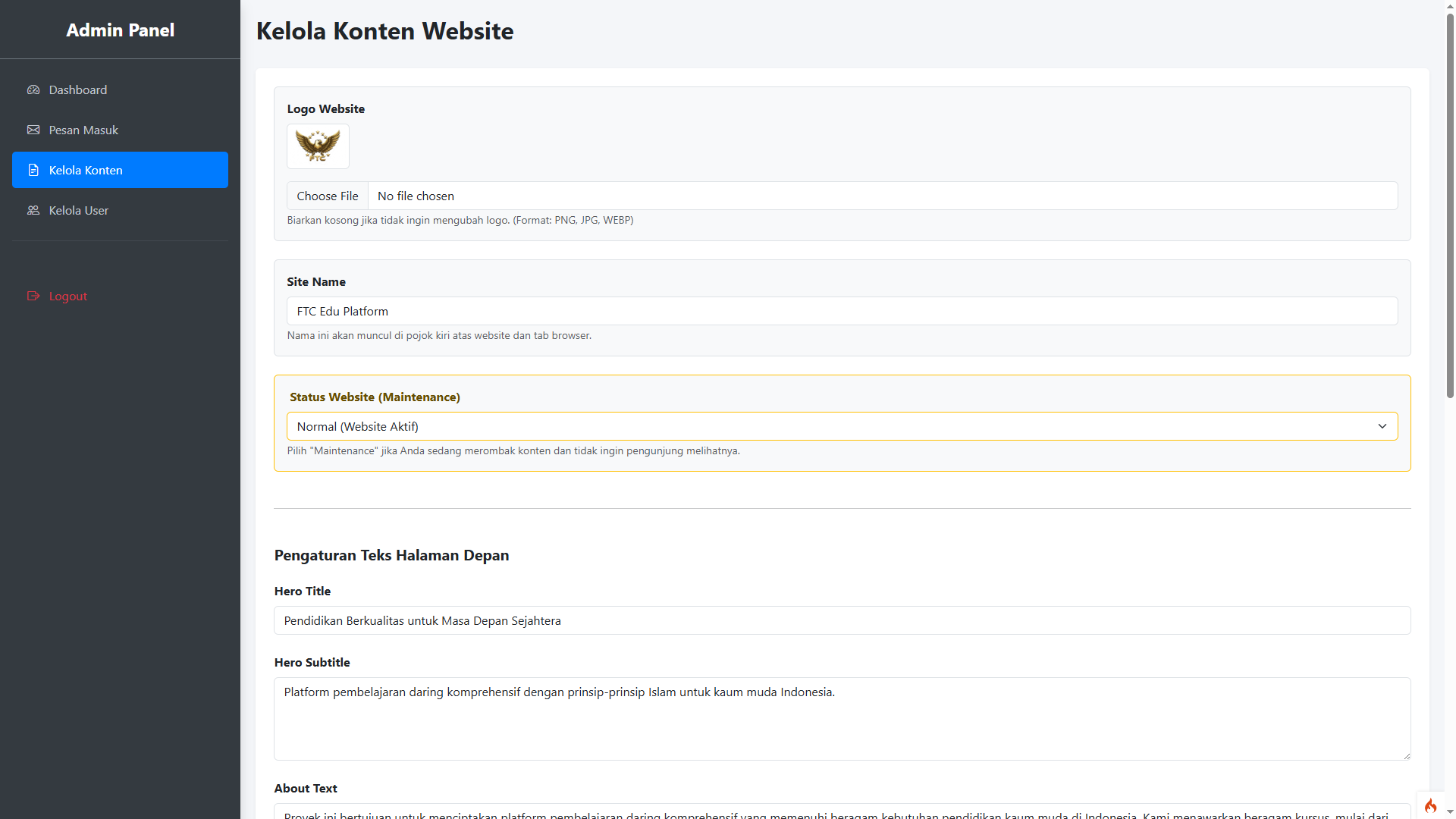⚙️ Zero-Coding CMS (Kelola Konten Mandiri) Bebas ubah nama website, logo, hingga seluruh teks penjelasan layanan di halaman depan langsung dari Dashboard Admin. Tidak perlu lagi membongkar kode program, cukup ketik dan simpan!