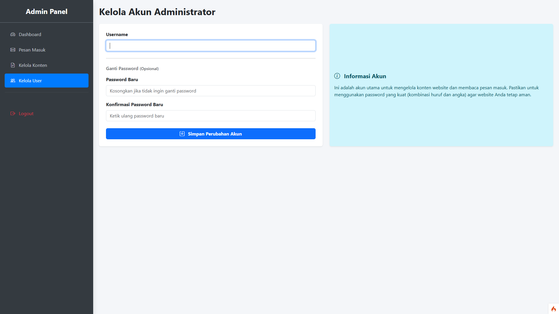 🔒 Admin Panel Super Aman Dilengkapi dengan gerbang Login yang aman dan halaman manajemen akun administrator khusus, di mana Anda bisa mengganti Username dan Password secara berkala dengan perlindungan enkripsi.