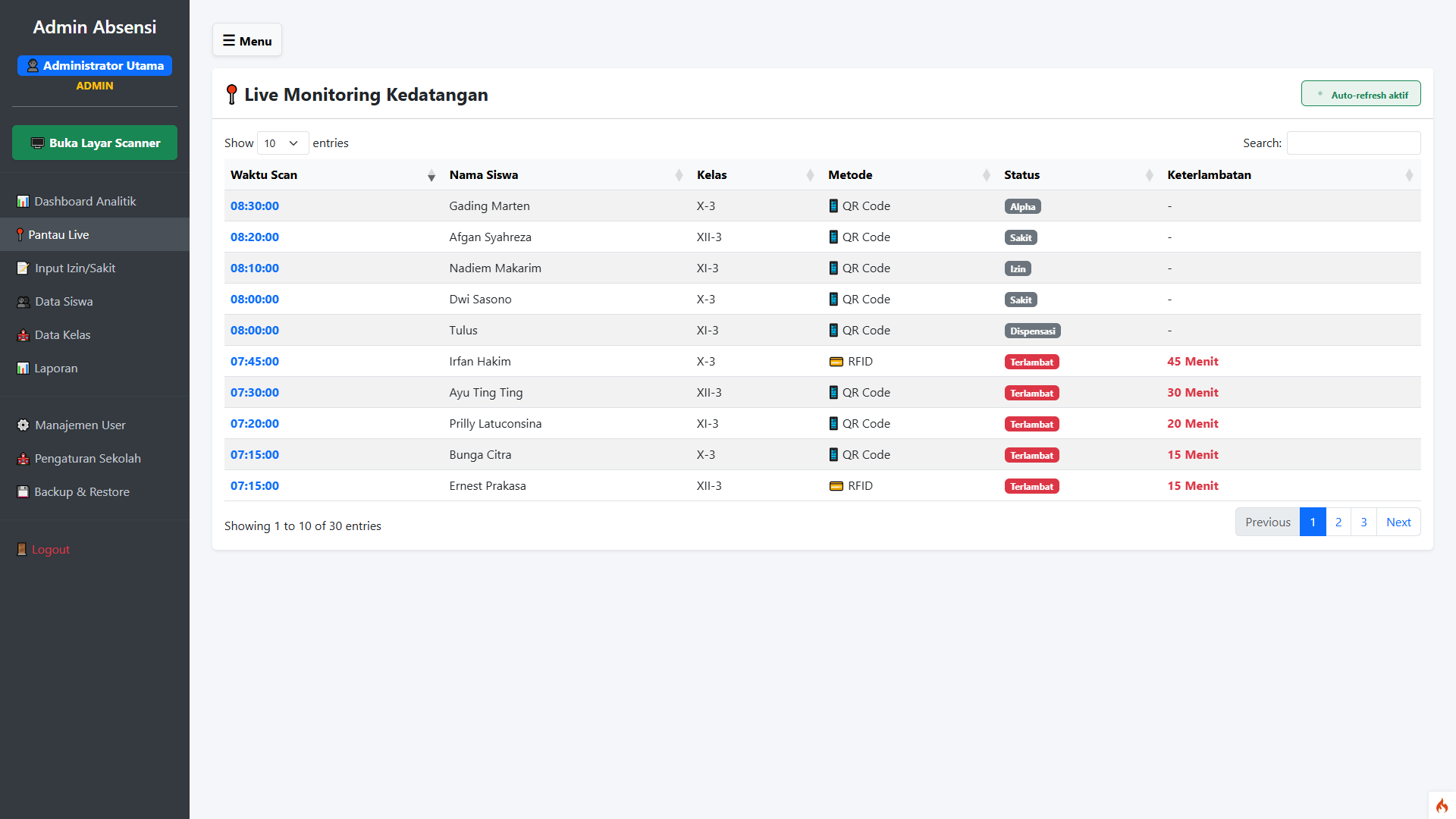 📍 Live Monitoring Kedatangan Guru piket atau Kepala Sekolah dapat memantau pergerakan absen siswa secara real-time dari ruangan masing-masing dengan fitur auto-refresh.