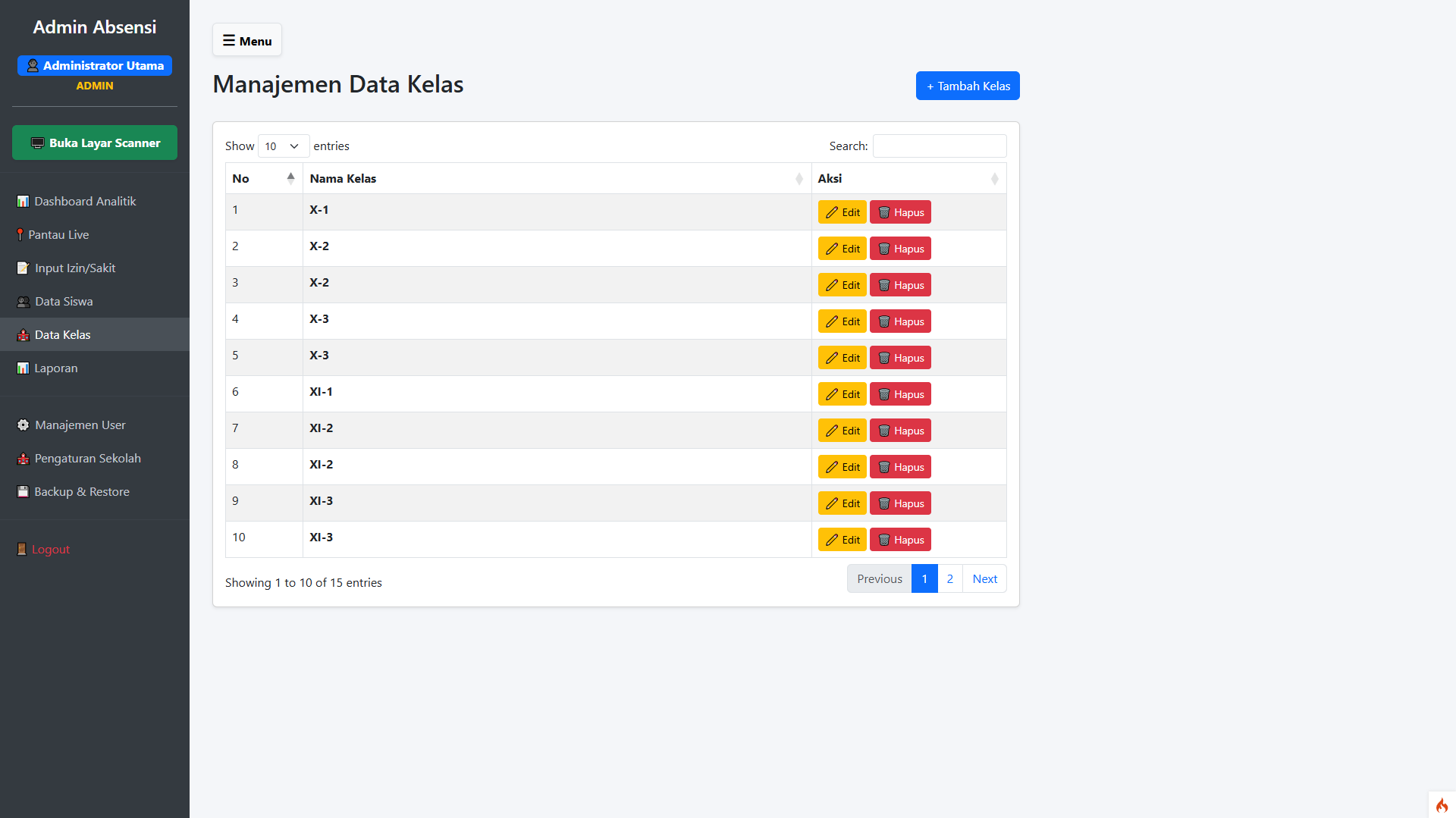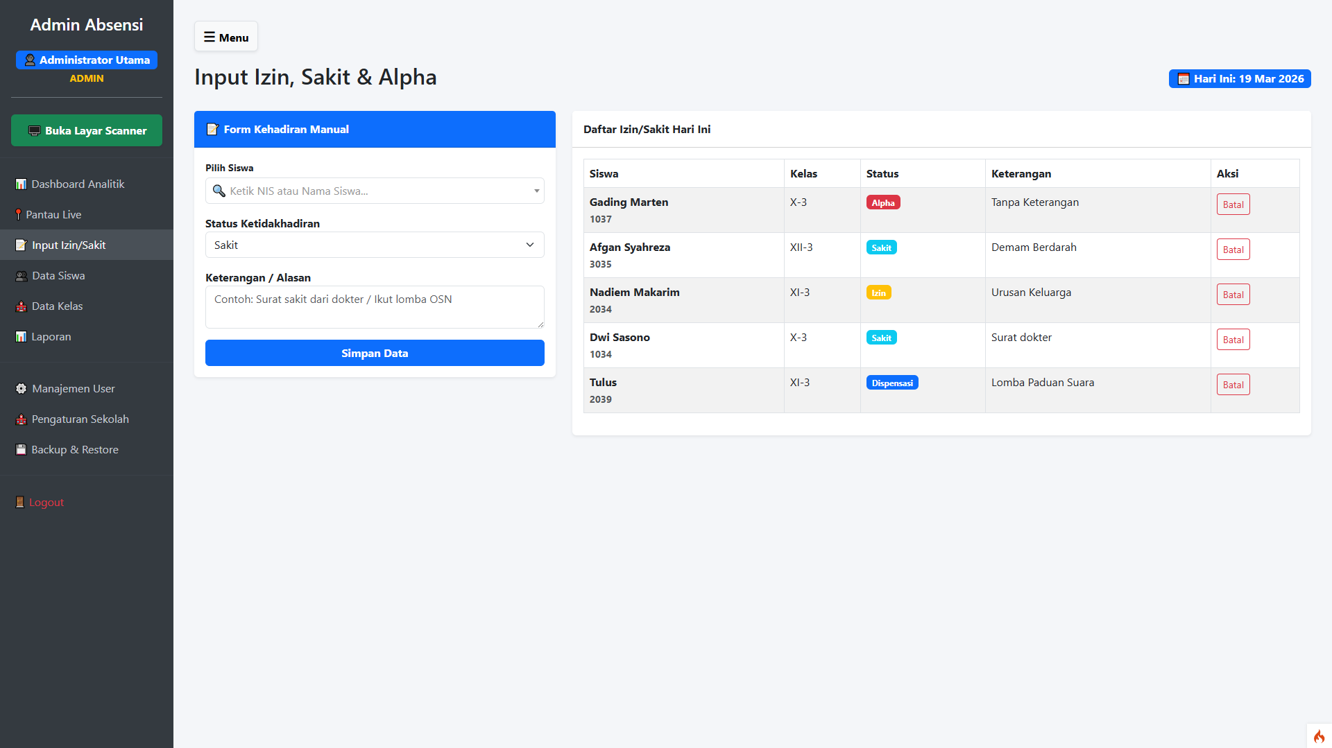Tinggalkan cara lama yang lambat dan rawan kecurangan. Sistem Absensi Cerdas adalah aplikasi manajemen kehadiran sekolah berbasis web yang dirancang untuk mempercepat proses absensi di gerbang sekolah. Dengan menggabungkan teknologi pemindai mutakhir dan dashboard analitik real-time, aplikasi ini tidak hanya mencatat data, tetapi juga membantu sekolah menganalisis tingkat kedisiplinan siswa secara akurat.
