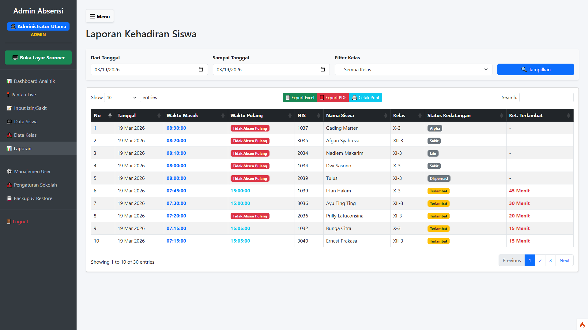 📑 Laporan Otomatis & Export Cepat Rekap kehadiran harian, mingguan, atau bulanan hanya dalam hitungan detik. Laporan dilengkapi status "Hadir", "Terlambat", "Sakit/Izin/Alpha", hingga deteksi cerdas "Tidak Absen Pulang" (Bolos). Bisa langsung di-export ke PDF dan Excel.