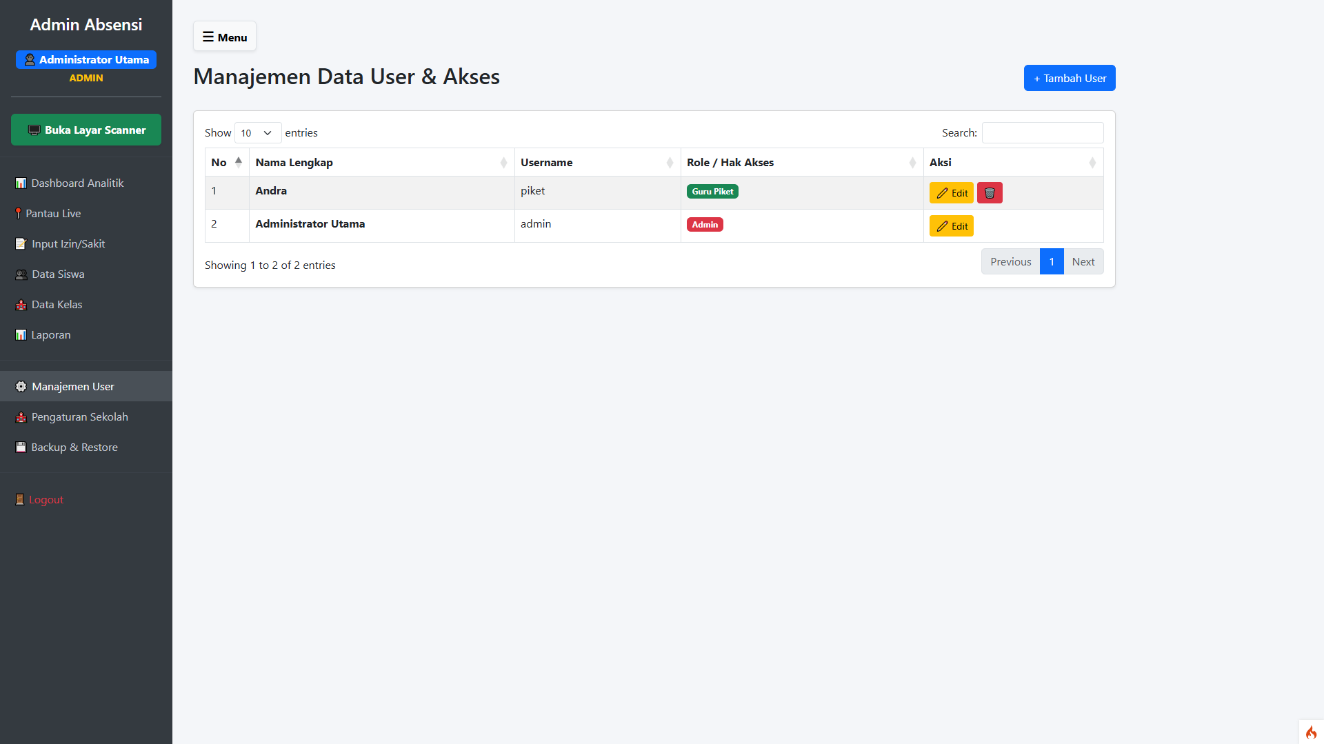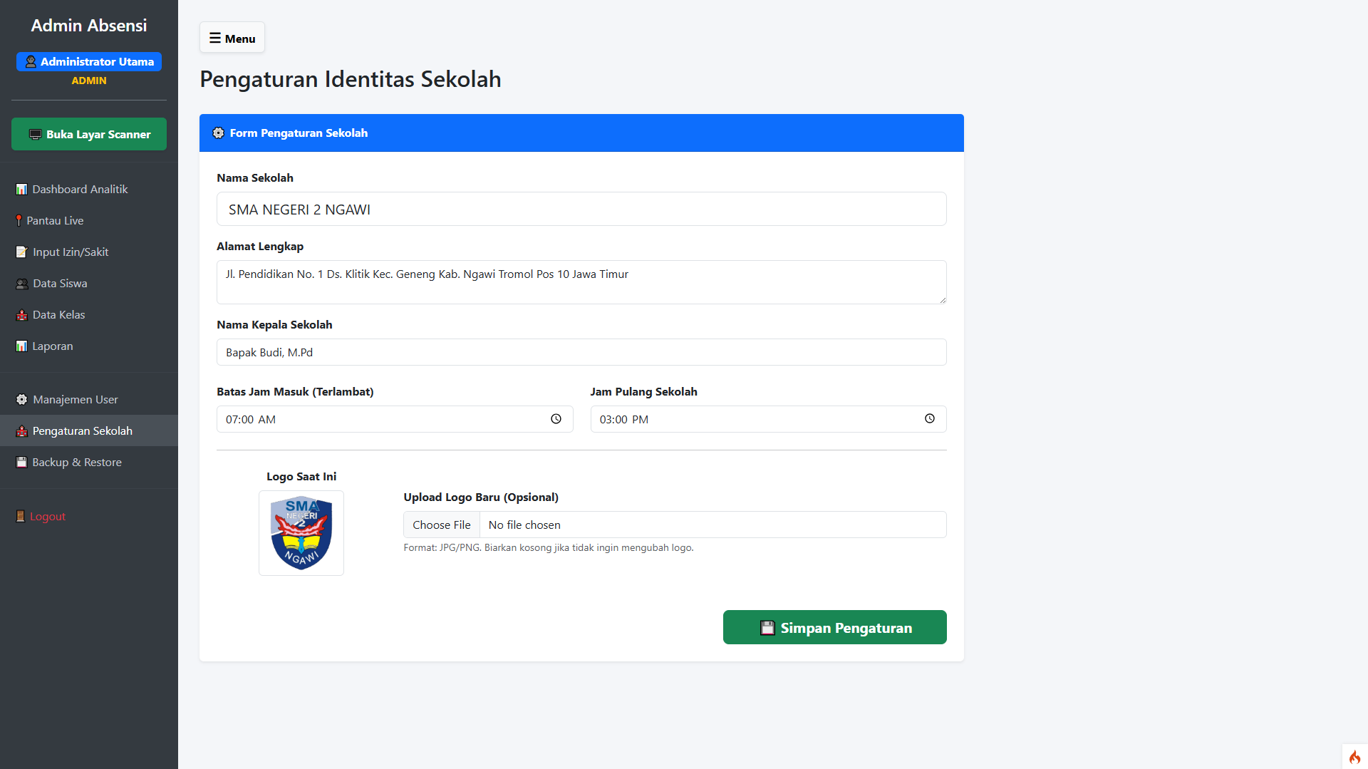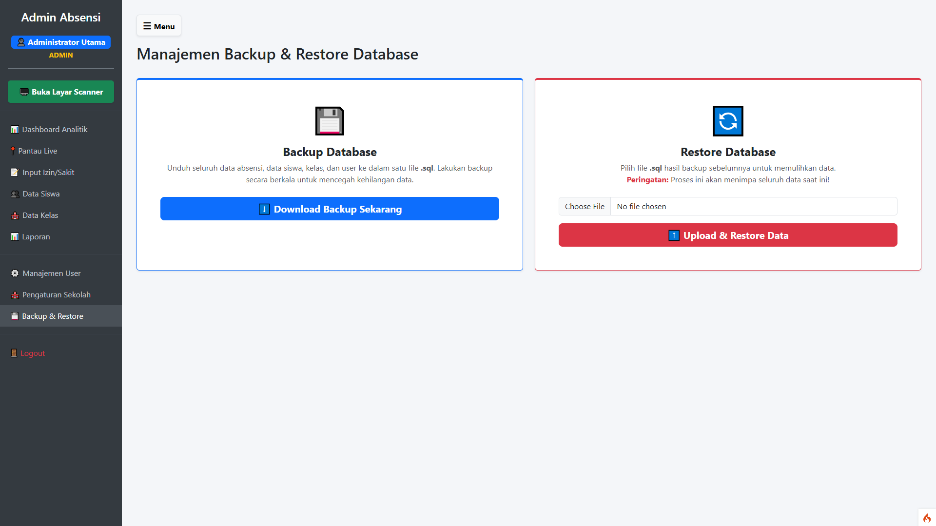 🛡️ Sistem Keamanan & Backup Otomatis Akses Kiosk dilindungi sistem Login untuk mencegah siswa memanipulasi absensi dari rumah. Dilengkapi juga dengan fitur Backup & Restore database 1-klik untuk keamanan data jangka panjang.