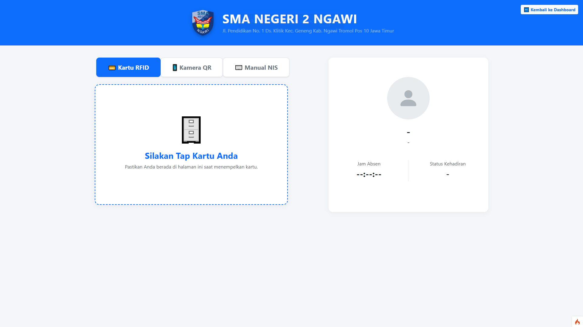 💳 Kiosk Scanner 3-in-1 (Anti-Macet) Siswa bisa absen menggunakan Kartu RFID (kurang dari 1 detik) atau Kamera QR Code. Siswa lupa bawa kartu/HP? Ada fitur Input Manual NIS khusus sebagai cadangan. Semua tersaji dalam satu layar Kiosk yang elegan!